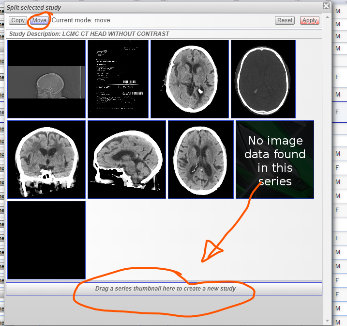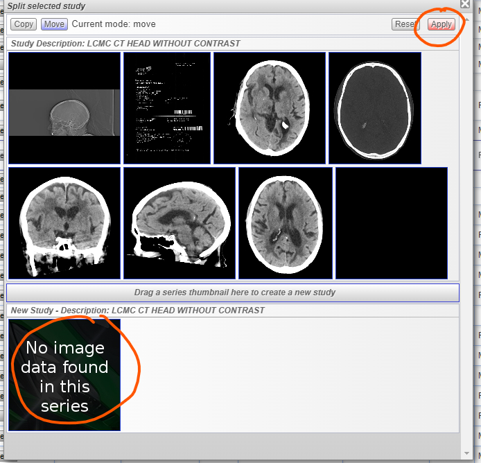 3. Select the image/series to be move/split then drag to the lower part "Drag a series thumbnail to create a new study".