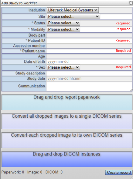 Note: When using the Add study feature, the study records are created before the DICOM instances are transferred to the PACS. This means that the patient information entered in the 'Add Study' panel will not be overwritten by data in the DICOM header.Communication