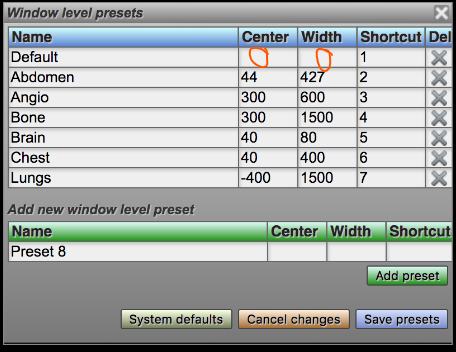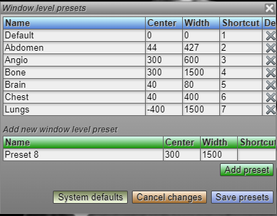 Once the user is satisfied with the preset window levels, the user must click the "Save presets" button.