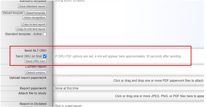 After opening the report study page, find the Send HL7 ORU field. If you are unable to find this field, you can contact your PACS Administrator to add it to your account.
